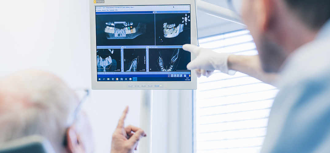 Ferner setzen wir die Digitale Volumentomografie (DVT) ein, um dreidimensionale hochauflösende Bilder, vor allem in der Implantologie, zu verwenden, die uns sehr gute Einblicke in die OP-Areale geben und zur sicheren Behandlungsplanung beitragen.